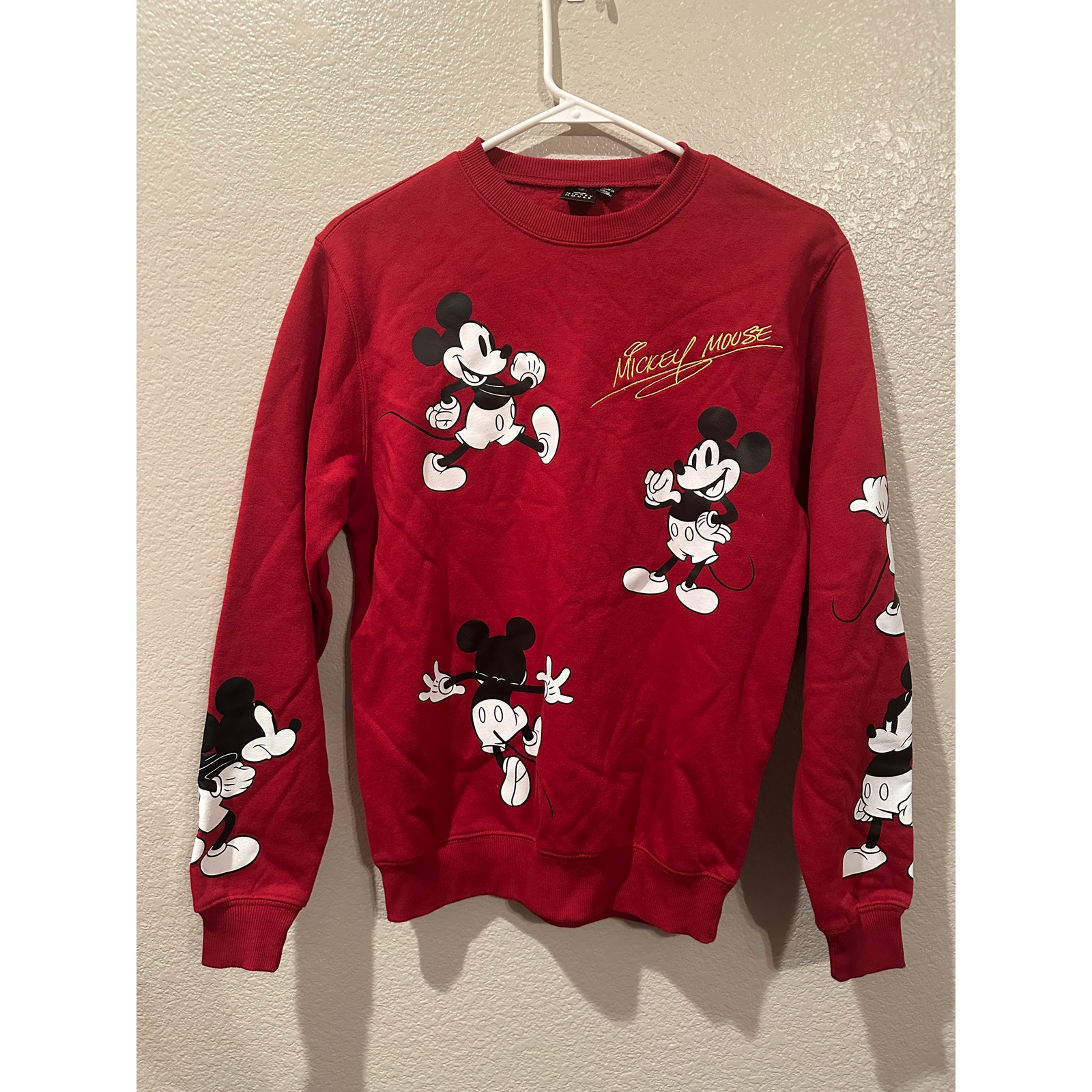 Red crewneck sweatshirt featuring multiple graphic prints of the Disney character Mickey Mouse. The sweatshirt has long sleeves and made from a comfortable material, cotton blend. The front of the sweatshirt prominently displays several images of Mickey Mouse in various poses, along with the signature text "MICKEY MOUSE" in a stylized font. Additional Mickey Mouse graphics are present on the sleeves. The overall theme of the sweatshirt is casual and showcases the iconic Disney character.